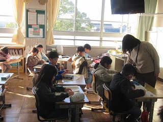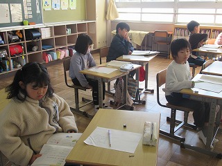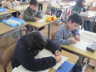 2年1組は国語の時間でした。絵日記につながる楽しかった思い出を考えて、文章を書いている子が多かったです。