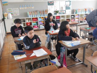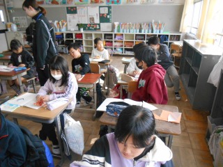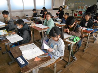 三角形の性質について、折り紙を切り取り、実物で学習をしていました。