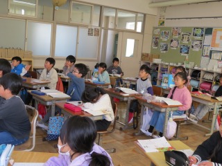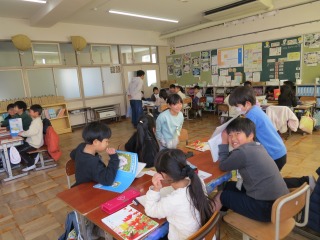 作品のまとめの時間でした。学習し、心を動かされた場面について感想を交えて作文し、グループで発表していました。