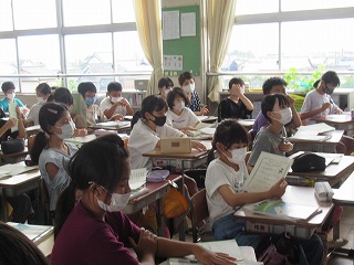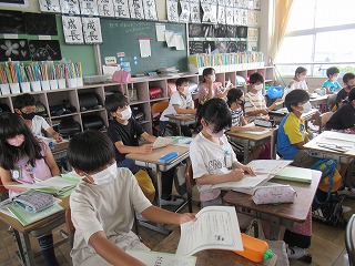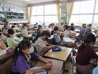 5年1組では、明日の野外活動に向けて、確認をしていました。また、夏休みの課題についての説明も行われていました。