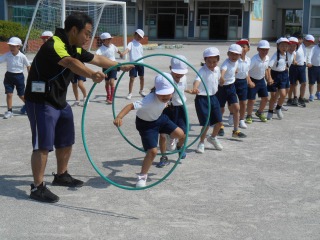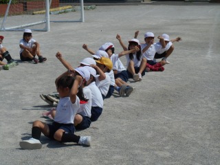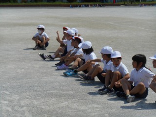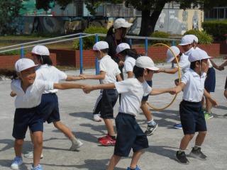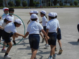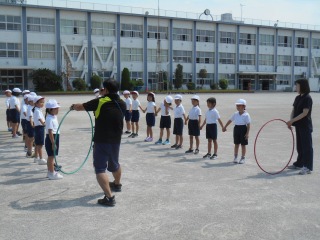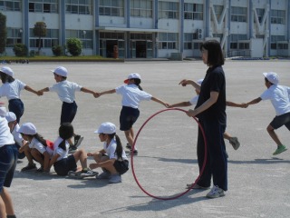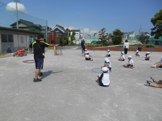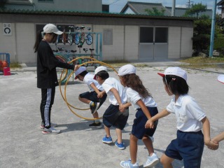 今日は外で、フラフープを使って運動をしていました。フラフープ1本、2本と増やし、手をつないでくぐります。早く全員がくぐり終わり、座った列が1位です。盛り上がっていました。