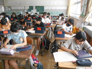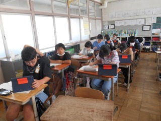作文を書いていました。タブレットで情報を収集しながら、書いていました。