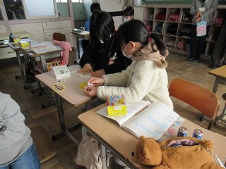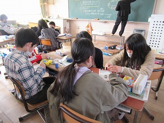 5年1組が教材を使い、理科の実験を行っている様子です。