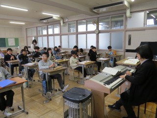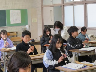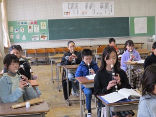 リコーダーをみんなで演奏していました。先生のピアノに合わせ、きれいな音色が響きました。
