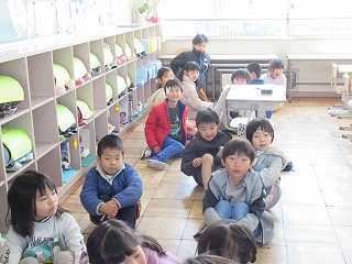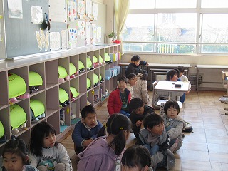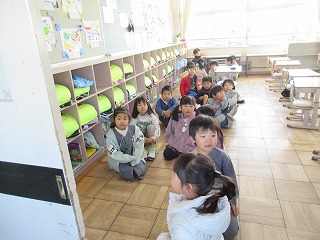 1年1組では、朝礼のため、教室の後ろに並び、準備オーケーでした。