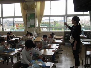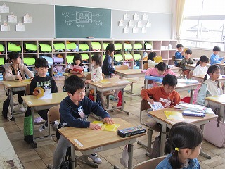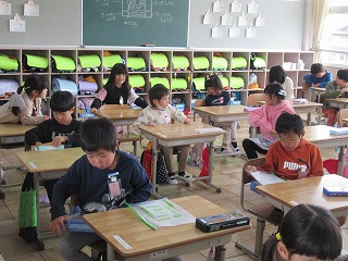 1年2組は国語の時間でした。先生の指示を聞いて、準備をしたり、片付けたりと活動を行っていました。
