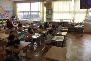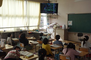 1年1組の国語は、「ほかのどうぶつのあかちゃん」の学習でした。モニター画面で写真を見ながら、教師の範読を聞きました。