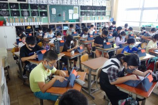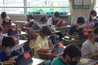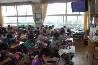 5年2組の国語は、調べたことをもとに住み良い町づくりを考える作文の学習でした。まず、タブレットで資料集めを行いました。