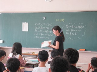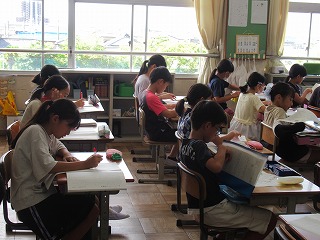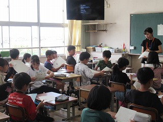 5年2組は朝礼後、教室で配り物をしていました。夏休み明けの初日なので、配布物がたくさんありますが、おうちの人に忘れずに渡してくださいね。