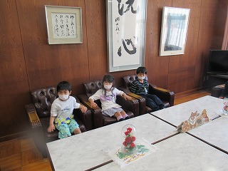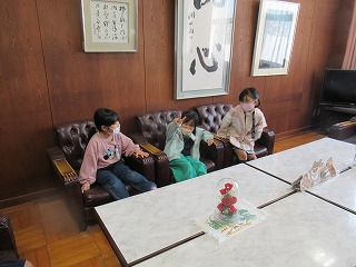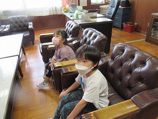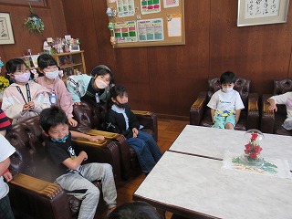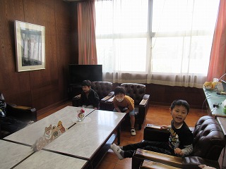 2年生が、1年生に学校たんけんをしてあげるために、校内の見学にやってきました。校長室での様子です。ソファーに座り、うれしそうでした。