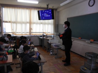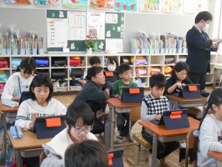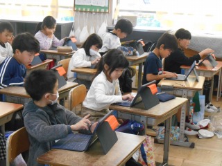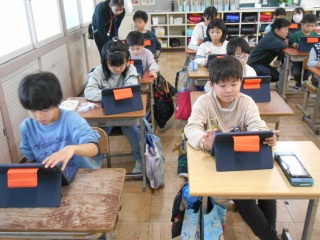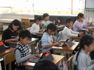 あま市ICT支援員の方に、タブレットを使ったタイピング練習をしていただきました。手の置き方、どの指でどのキーを押すといいか、学習をしていました。