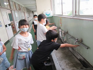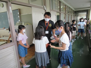 給食前、子どもたちは手洗いをしっかり行っています。また、消毒も担任の先生に吹きかけてもらっています。やるべきことをしっかり取り組んでいきましょう。