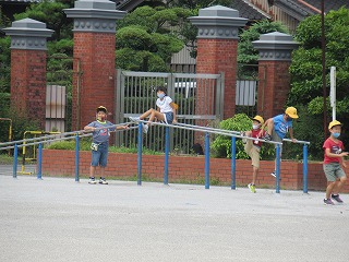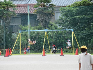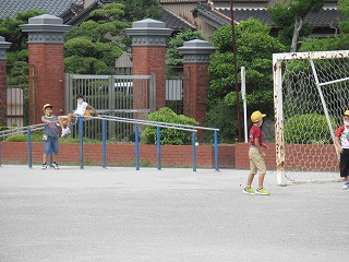 休み時間のようすです。みんな運動場で元気に遊んでいます。