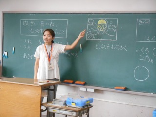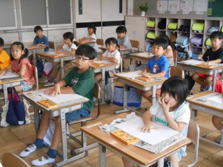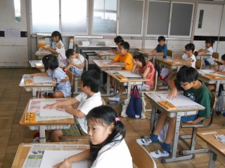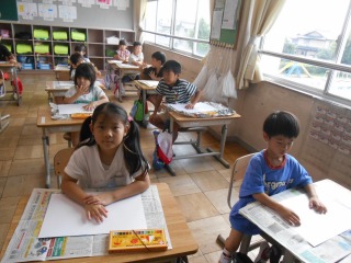 夏の思い出を絵にします。クレヨンを用意し、紙面に大きく描くようにアドバイスをもらっていました。