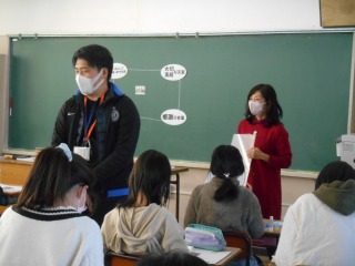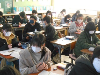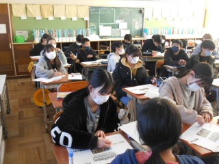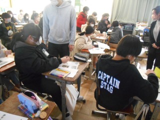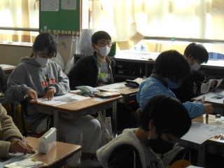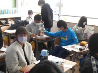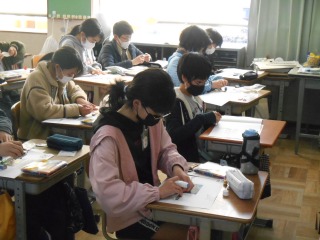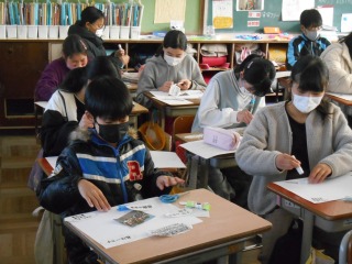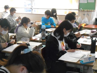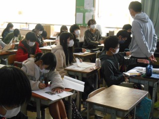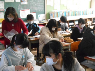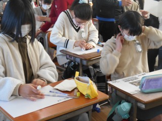 いつも朝礼やタイピング練習などのリモートによる学習を提供してくださっている、ハッピートークアカデミーの方が、今日は実際に教室に来てくださいました。今の自分を見つめ、いいところを画用紙に書いているところでした。