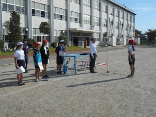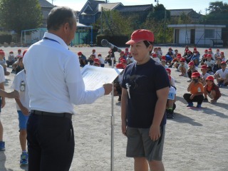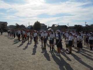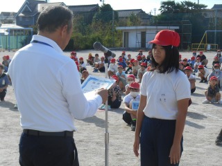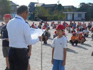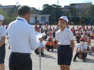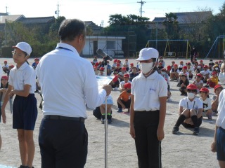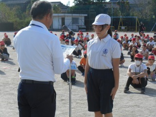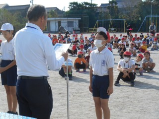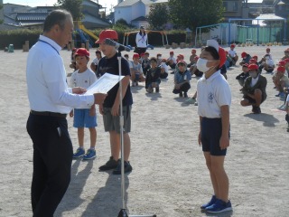 今日は1時間目にミワリンピック全校練習があるため、運動場で朝礼を行いました。朝礼では、読書感文コンクールの表彰、後期児童会役員の認証を行いました。