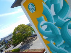 右手前に西館の大胆なデザイン画、中央に楠の木、そして左奥に美和小の正門(南門)です。