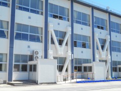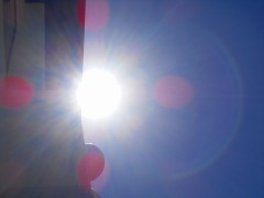 一日中、雲一つなく澄んだ空。太陽に校舎の窓が輝いています。