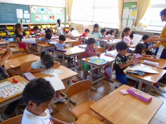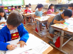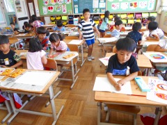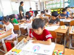 1年生は、図工で「お日様」の絵を描きました。いろいろな形で、いろいろな色で、自分だけの「お日様」の完成です。