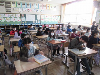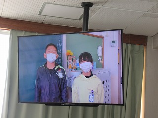 2年2組では、朝の時間、児童会からのお知らせをモニターで見るところでした。
