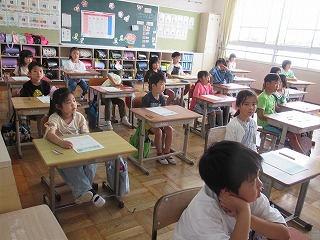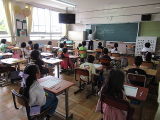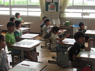 2年2組はテストを行っていました。まず、事前の準備を行い、名前の記入方法や答え方などの確認を行っていました。