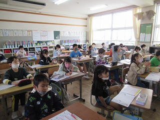 3年1組では、国語の時間、先生がかぶりものをして、漢字の勉強をしていました。