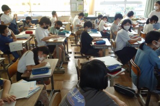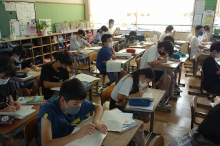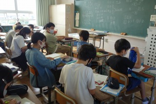 6年1組の算数は、比の学習でした。プリントの問題をみんなで解きました。