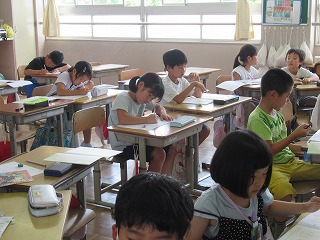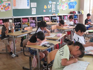 2年1組は書写の時間でした。横書きの文字の書き方を練習していました。上下のすき間のバランスに気を付けて、上手に書けたかな?