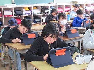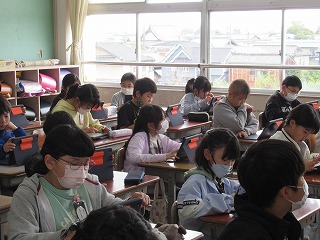 5年2組は、学級目標を決めていました。ロイロノートに自分の考えた学級目標を入力して、みんなはその中から気に入ったものにタブレット内で投票を行っていました。