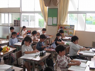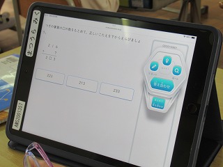 3年2組は算数の時間でした。モニターに映った計算問題が解けた児童から、タブレット内のeライブラリで自分で課題を選んで問題を解き始めました。個別に最適な学習ができるという面で、効果的ですね。