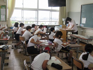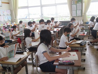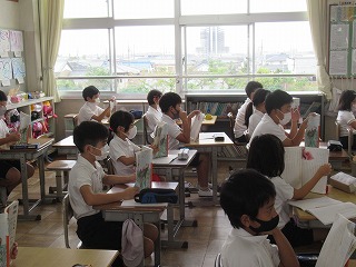 3年1組では、国語の時間「ちいちゃんのかげおくり」の勉強をしていました。先生が実際に動作をみせて、確認をしていました。みんな積極的に意見を述べていました。