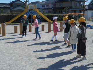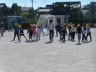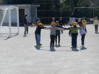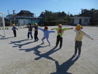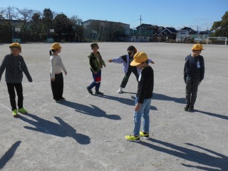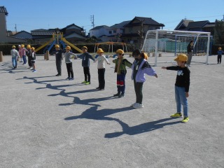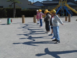 太陽が低くなり、影が長くなってきました。1列に並び、手をつながずに影が手をつないで見えるように、工夫していました。「次は、円になったらどうなるだろう?」と言い始める子がおり、チャレンジしていました。