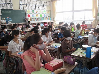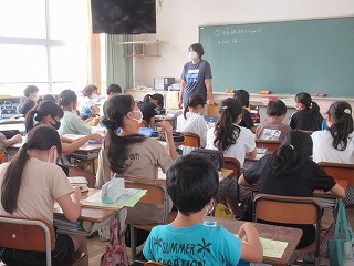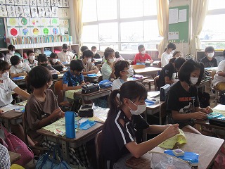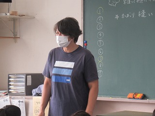 5年1組では、家庭科の裁縫の授業が行われていました。初めは、先生のお話からです。裁縫は、みなさん上手にできるようになったかな?