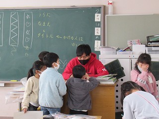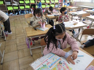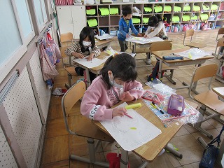 1年1組では、図画工作の授業を行っていました。工作の案を先生に見せていました。すてきな作品をつくってくださいね。