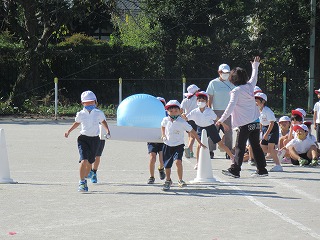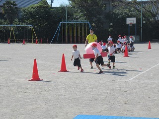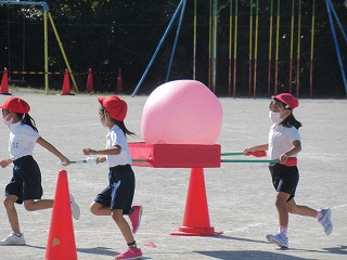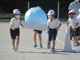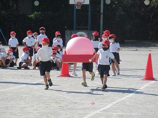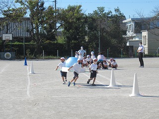 大玉を入れる箱をリニューアルし、子どもたちは、やりやすくなりました。みんな一生懸命、また、友達と協力し合って、競技していました。