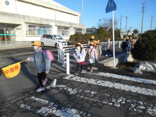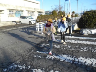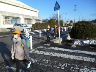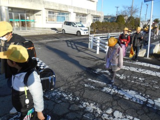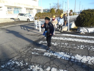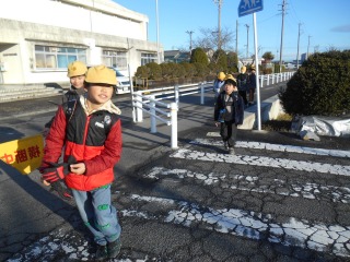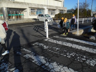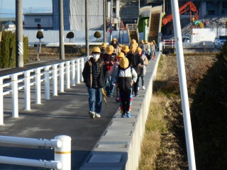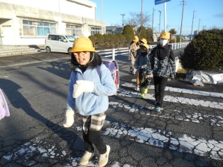 見守り隊の方と一緒に、安全に登校してきました。ふと背景を見ると、旧市役所の解体工事が日に日に進んでいます。
