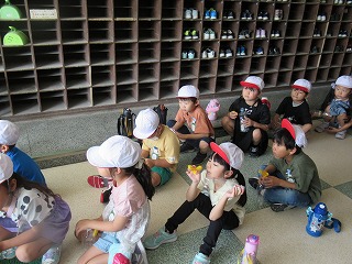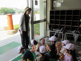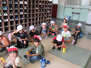 1年2組では、生活科の時間、あさがおの種に水やりをしに行くところでした。先生の話をしっかりと聞き、立派な姿でした。