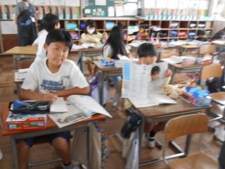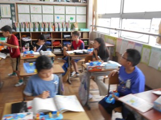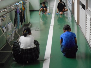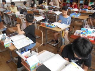 電池を使った車を廊下で走らせていました。電池を直列、並列それぞれに回路を組み、違いを知ることができました。