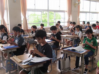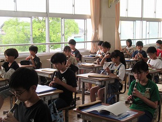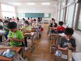 5年2組が、音楽室で音楽の授業を行っていました。リコーダー演奏をしていました。美しい音色が音楽室中に広がっていました。