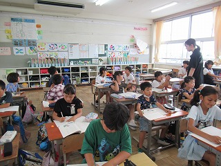 3年2組では、国語の授業が行われており、子どもたちはノートにまとめていました。