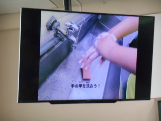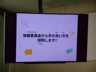 今日の給食の時間、保健委員会の児童が全教室で手洗いの呼びかけをしました。石鹸を使うこと、手の洗い方を写真で紹介していました。