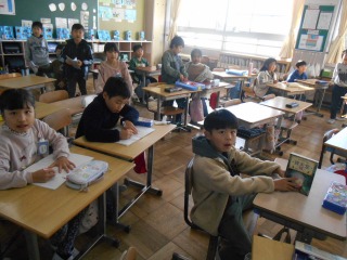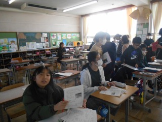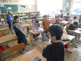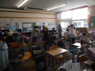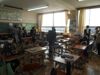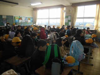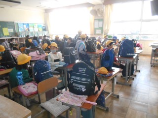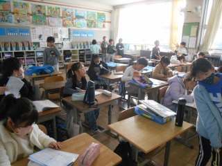 今日は5年生が校外学習へ出かけます。注意点を確認していました。