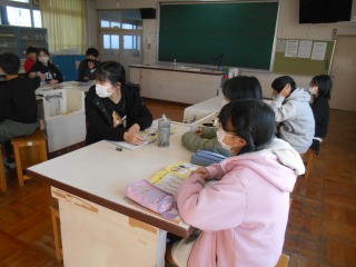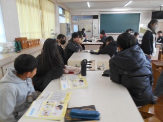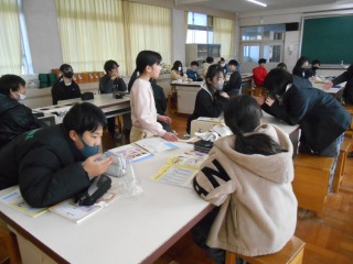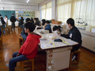 水溶液について学習していました。アンモニアと塩酸を混合した水溶液の入ったフラスコを順番に回し、臭いの確認の仕方を実践していました。