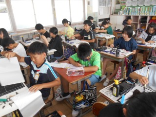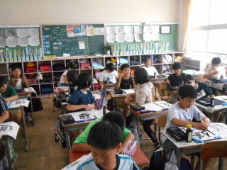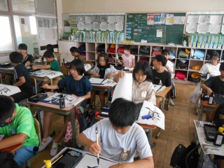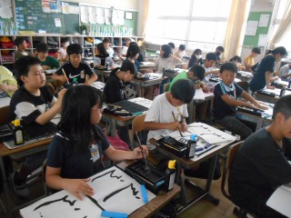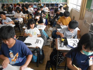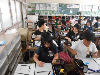 「道」を書く練習をしました。しんにょうの練習をまず行い、筆の向きを覚えました。