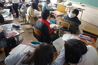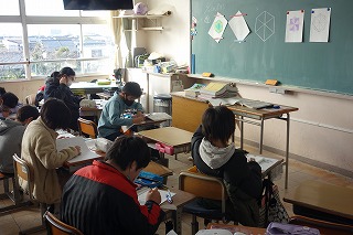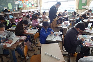 5年2組の算数は、図形の作図の学習でした。見本の図形をもとに、書き方を考えながら取り組みました。