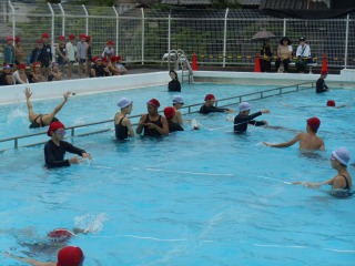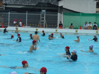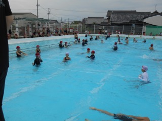 水温が温かい日となりました。ペットボトルをビート板代わりにして、ペアで交代しながら泳いでいました。