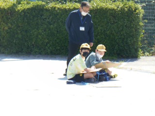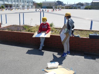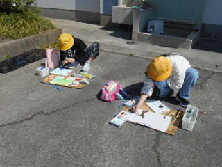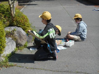 校舎の外へ出て、写生をしていました。立体的に花壇を描いたり、大きなくすの木をダイナミックに描いている子がいました。