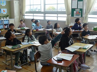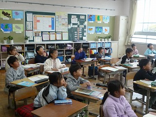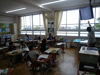 一人一人が点を結んで三角形や四角形をかき、それを大型モニターで見合いました。