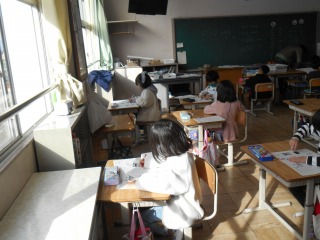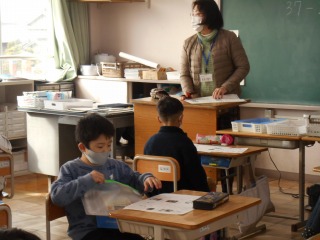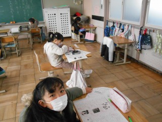 算数のテストが返却されていました。文章題が多くなり、読み取る力をつけるために直しをしていました。先生二人で、確認です。