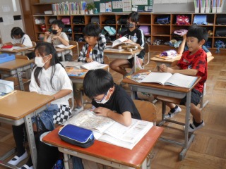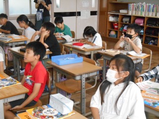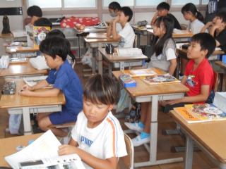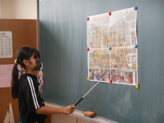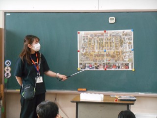 スーパーマーケットの店内の配置図を見て、どんな工夫がされているか気づいたことを発表していました。
